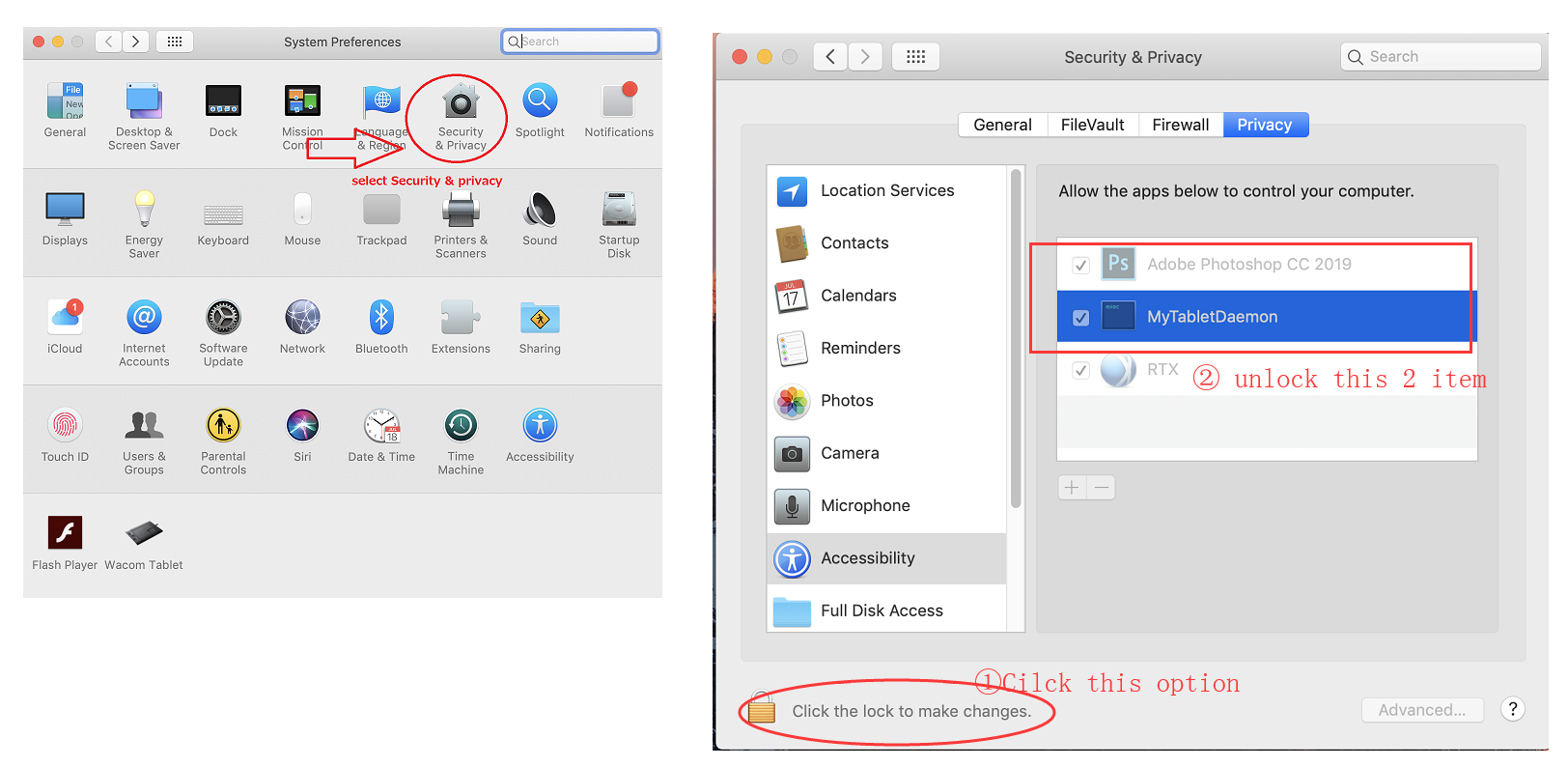 Bắt đầu với macOS Mojave (10.14), Apple có một chính sách mới yêu cầu sự cho phép của người dùng đối với trình điều khiển máy tính bảng của chúng tôi đối với các tính năng sau: