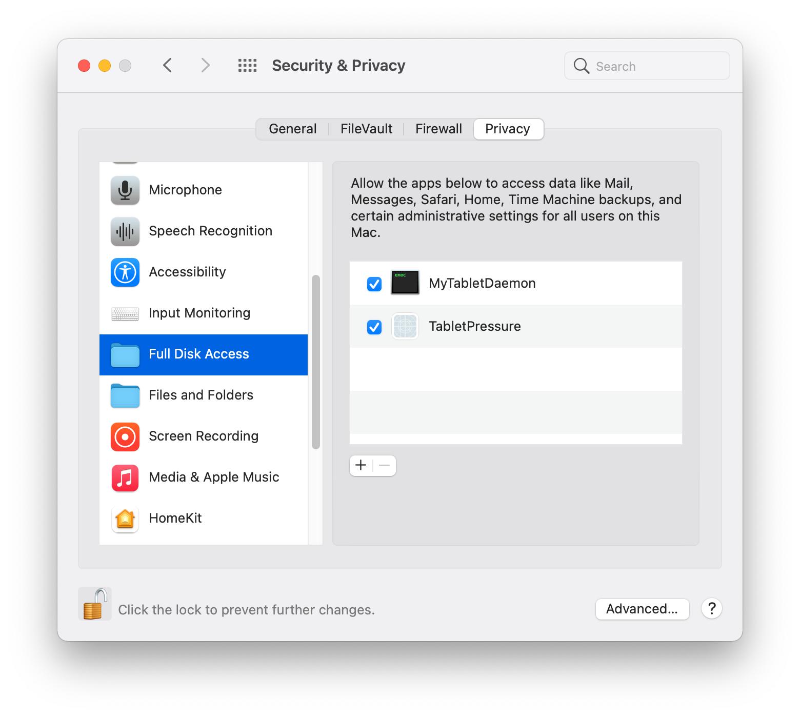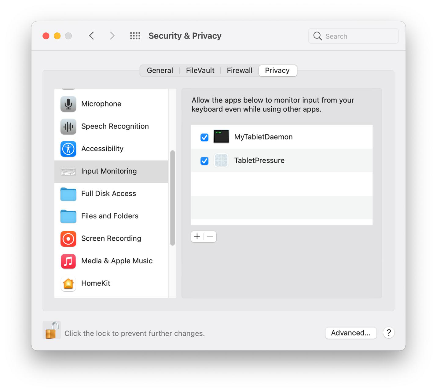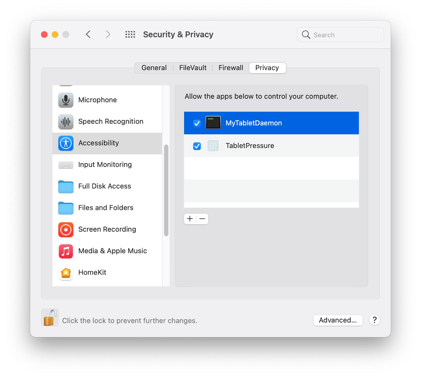 Làm theo các bước cài đặt Trợ năng được đề cập ở trên để thêm “MyTabletDaemon” và “TabletPressure” vào danh sách.